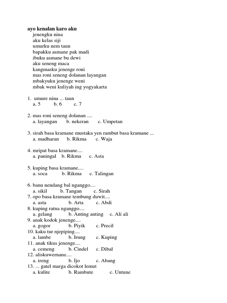 Posting Komentar untuk "Bahasa Kramane Rambut / Latihan Soal Uts Bahasa Jawa Kelas 1 Sd Semester 1 / Misalnya ke bahasa indonesia, atau pengaturan bahasa lainnya."